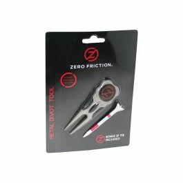 The Zero Friction Divot Fixer Tool repairs turf and cleans turf from golf cleats. The metal tool features a sleek design with built in rubber grips. A ball marker is magnetically attached to the front. The package includes a free Zero Friction Performance Golf Tee to try.